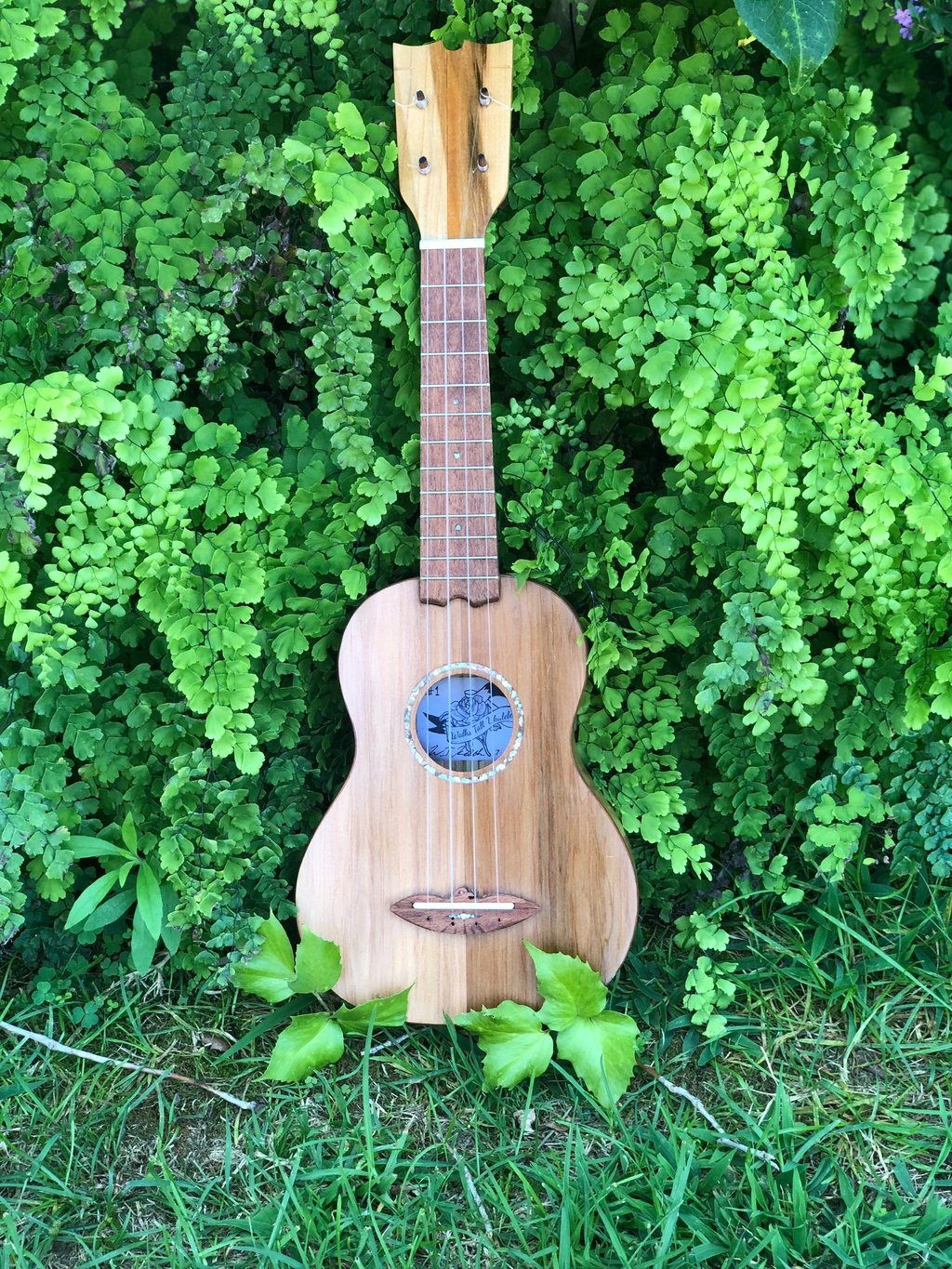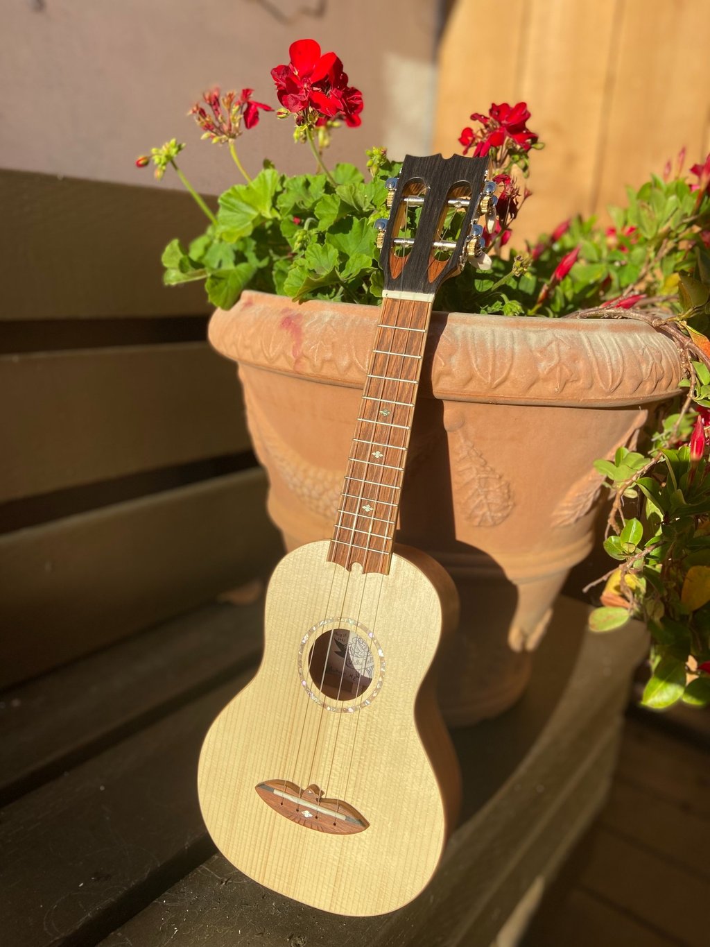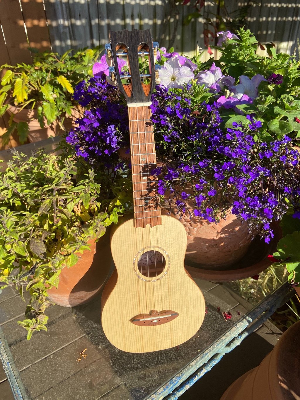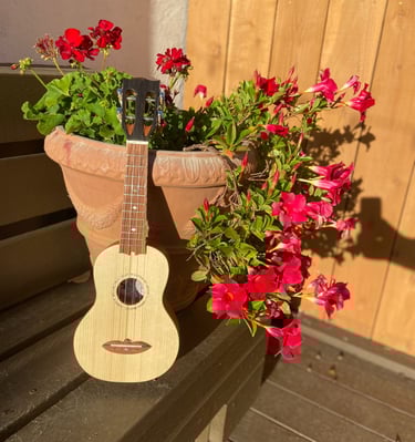 The most recent ukulele I built was for my friend's niece. It features an Adirondack spruce top, mahogany back and sides, cedar neck, oak binding, jatoba fretboard/bridge, abalone rosette, ebony head plate, and a slotted headstock. I built this ukulele during my off hours while working at Bourgeois Guitars using their equipment, but all the jigs were my own design (Bourgeois doesn't make ukuleles). The soundboard was actually made with cut-offs from a bourgeois guitar. I called this ukulele Forsythia since I finished the project right as our forsythia started blooming.