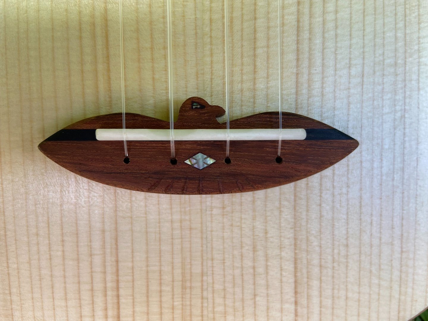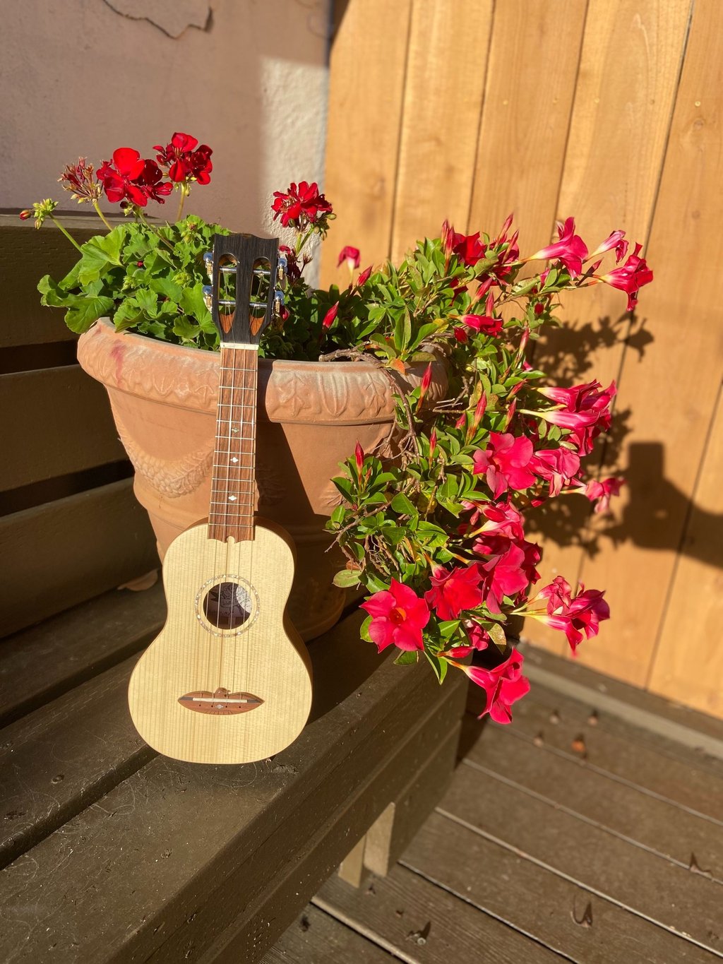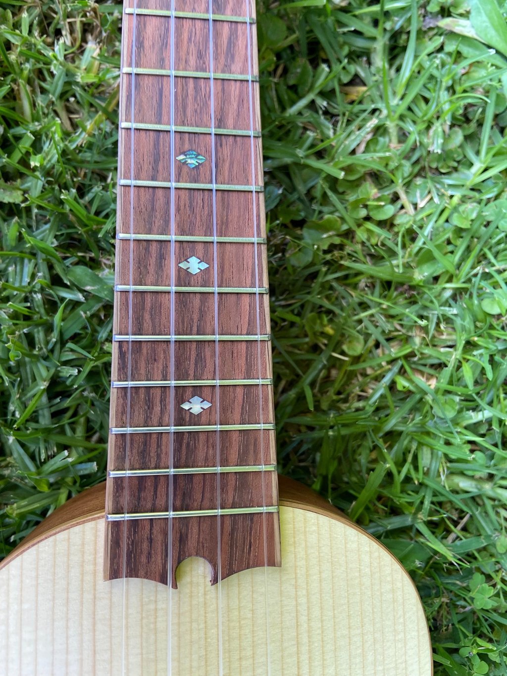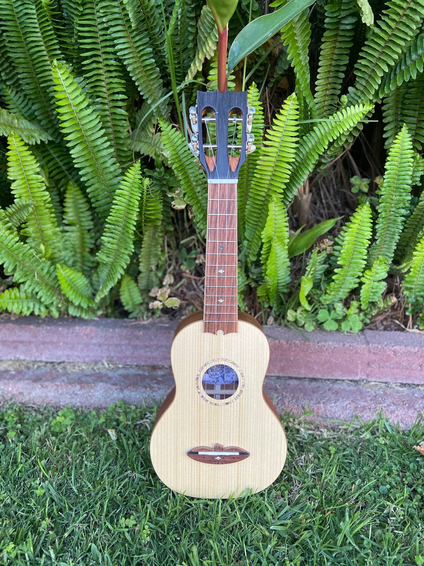 The most recent ukulele I built was for my friend's niece. It features an Adirondack spruce top, mahogany back and sides, cedar neck, oak binding, jatoba fretboard/bridge, abalone rosette, ebony head plate, and a slotted headstock. I built this ukulele during my off hours while working at Bourgeois Guitars using their equipment, but all the jigs were my own design (Bourgeois doesn't make ukuleles). The soundboard was actually made with cut-offs from a bourgeois guitar. I called this ukulele Forsythia since I finished the project right as our forsythia started blooming.