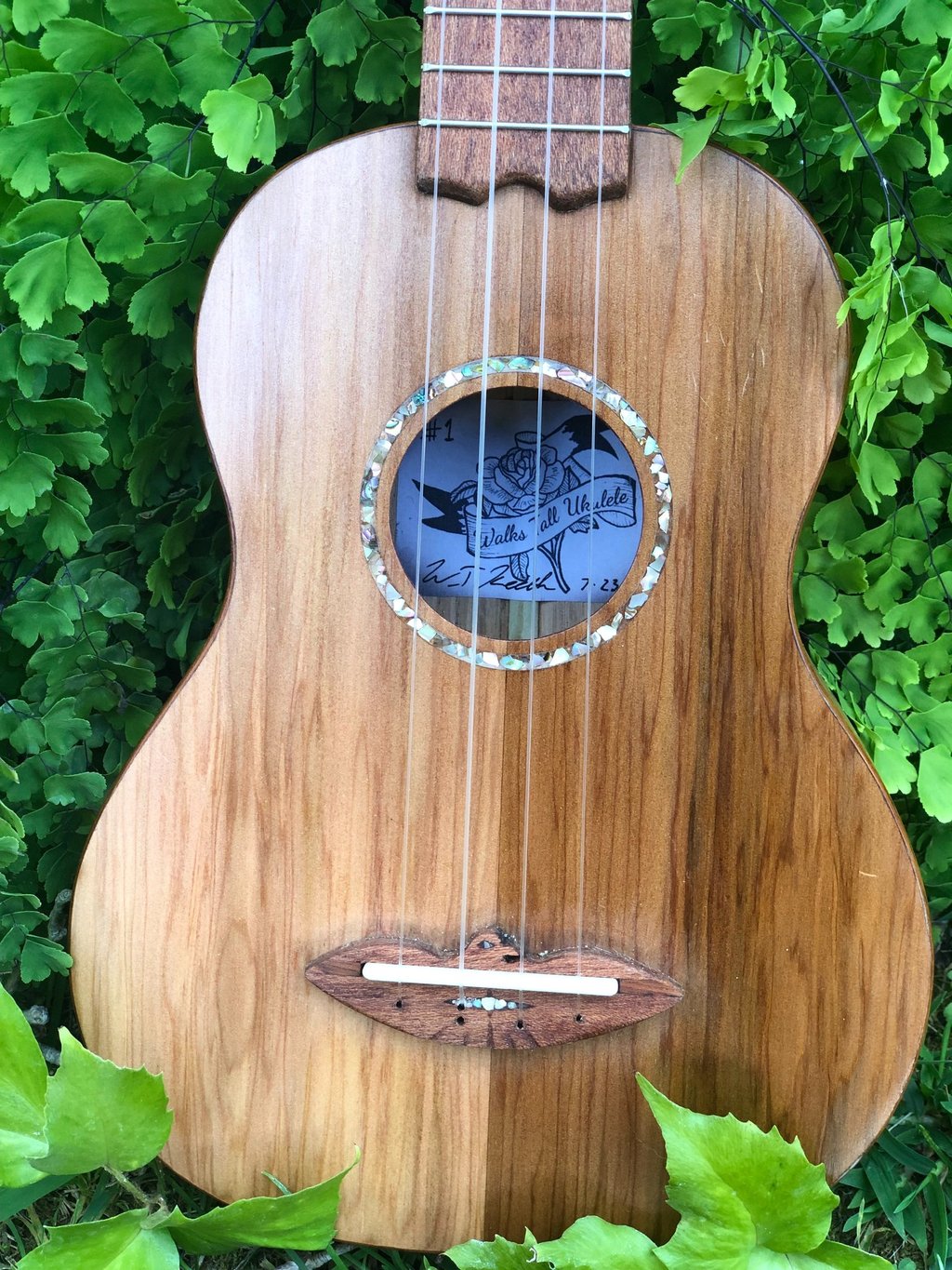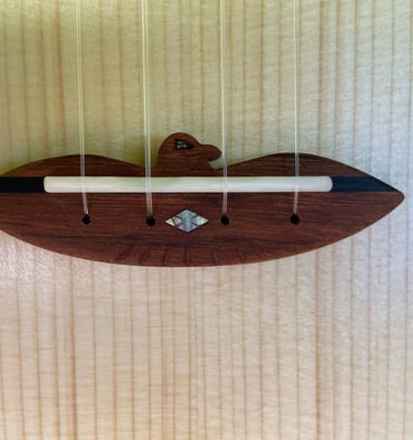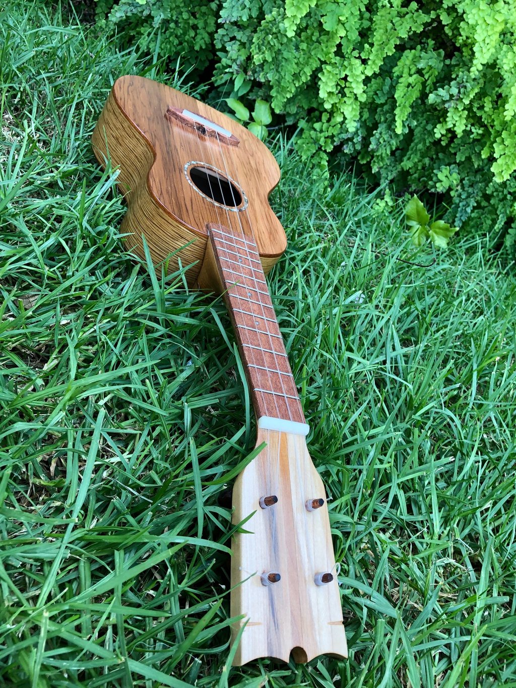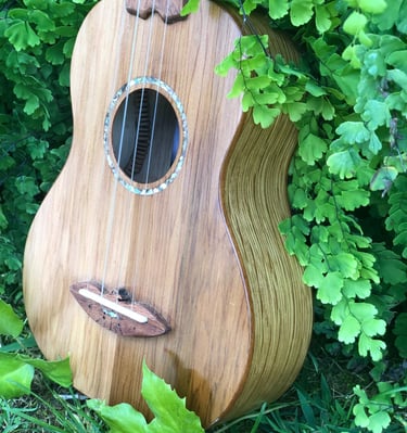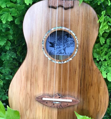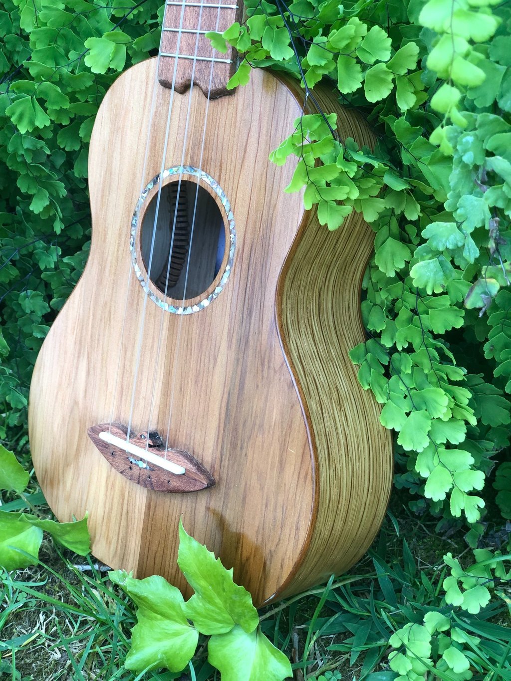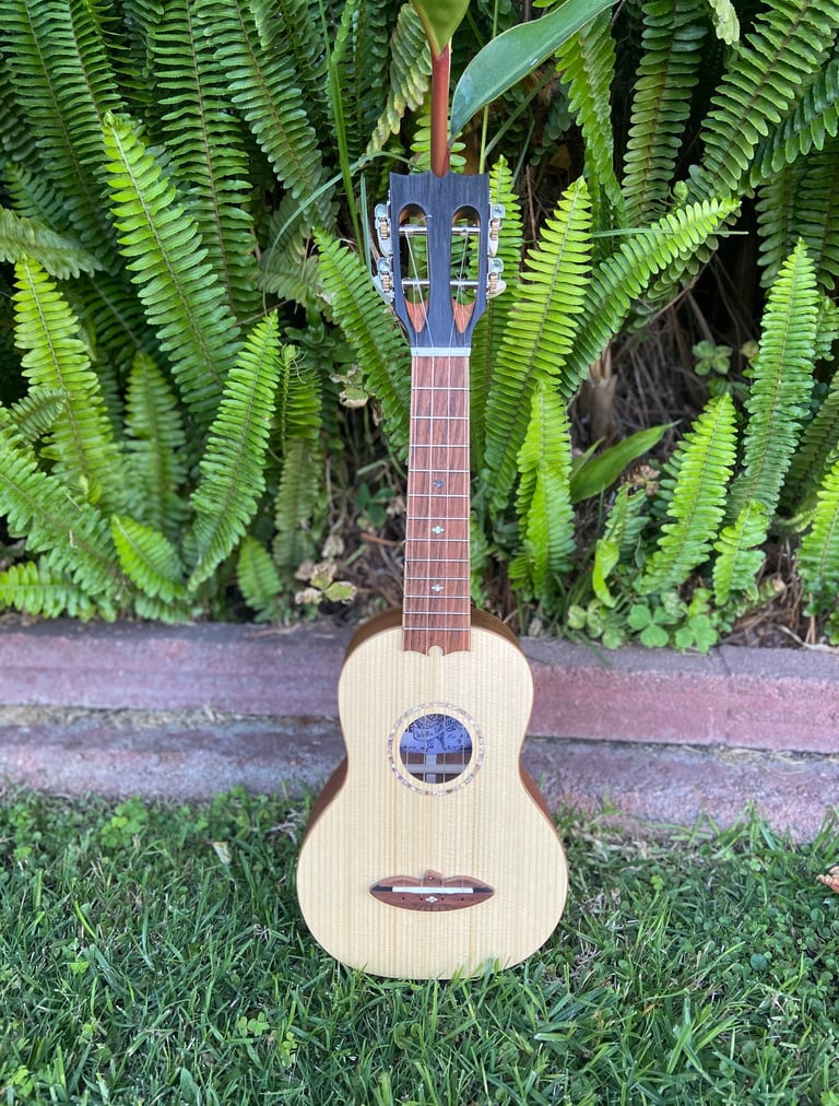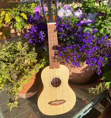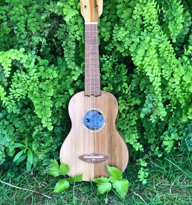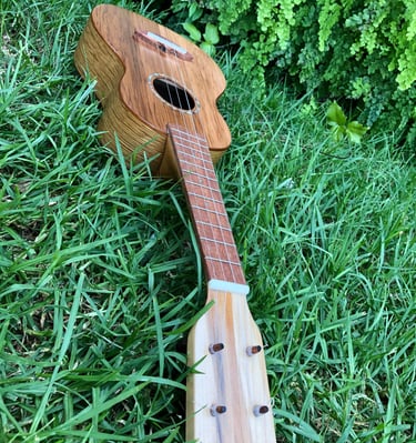 Adslia was the first ukulele I made entirely by hand. It was constructed out of parts found and donated to me by my colleagues at Ravenswood Studio in Chicago, Illinois. It features a cedar top, red oak back, white oak sides, maple neck with a cherry reinforcement stripe, jatoba binding, teak bridge, fretboard, and tuning pegs. Many luthiers might assume that a soprano ukulele would be a more straightforward first build due to its smaller size, but that's not the case. From experience, smaller instruments like ukuleles require greater precision in measurements, making them more challenging to craft. I didn't choose the ukulele for ease; I simply wanted to make my favorite instrument. At home, the tiny soprano ukulele is always the first thing I pick over all other instruments. It has a beautiful jangle that always makes me smile, even when playing the saddest melodies. I finished this ukulele at the shop in Chicago, but it wasn't until driving across the country, back to California, that I played her first chord. The journey back to California was during COVID, so we camped out on my grandparents' front lawn that night as I filed the nut slots, strung her up, and finally heard her sing. I named her Adsila in honor of my grandfather, whose ancestors were Cherokee, "adsila," meaning "blossom." That night, on Grandpa's lawn, Adsila rose from the earth like a flower pushing through cracked concrete, making that dark time a whole lot brighter.